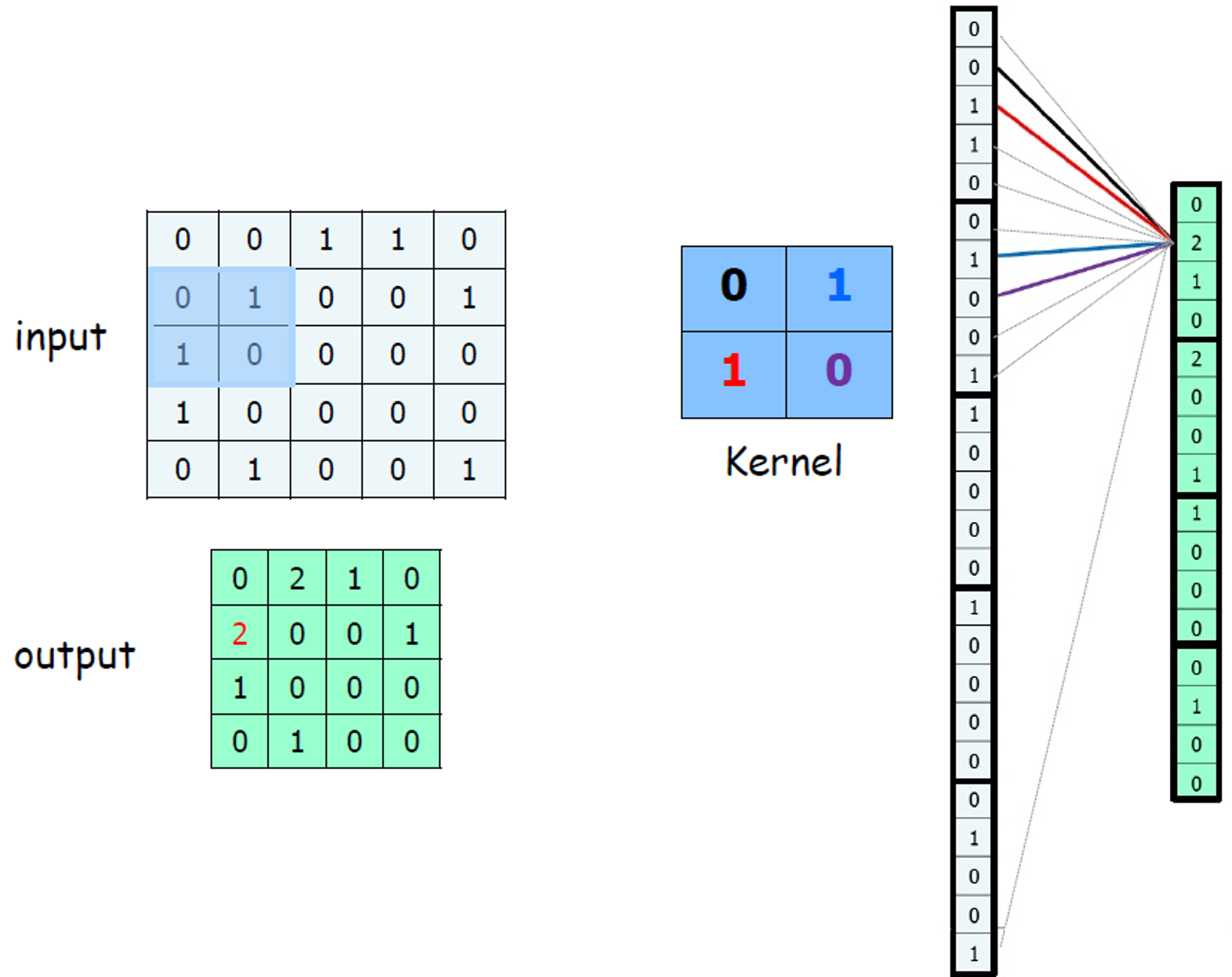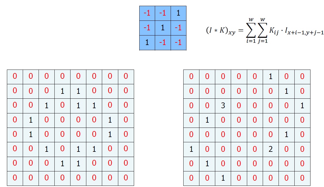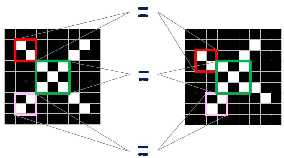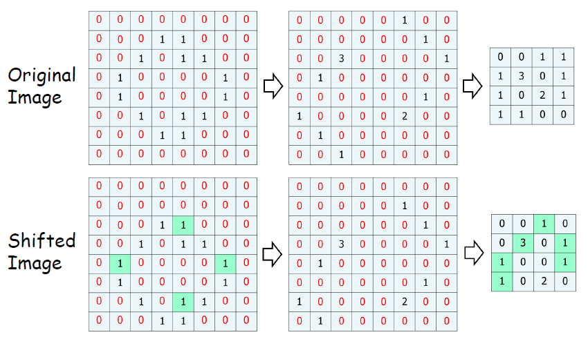 추가적으로 입력 이미지나 영상에서 특정 위치에서 발생한 특징이 다른 위치에서도 같은 방식으로 감지될 수 있도록 하는 효과를 가지고 있다. 아래의 그림에서 우리는 그림을 한칸 내렸지만 0이 아닌 값이 더 많이 일치한다.