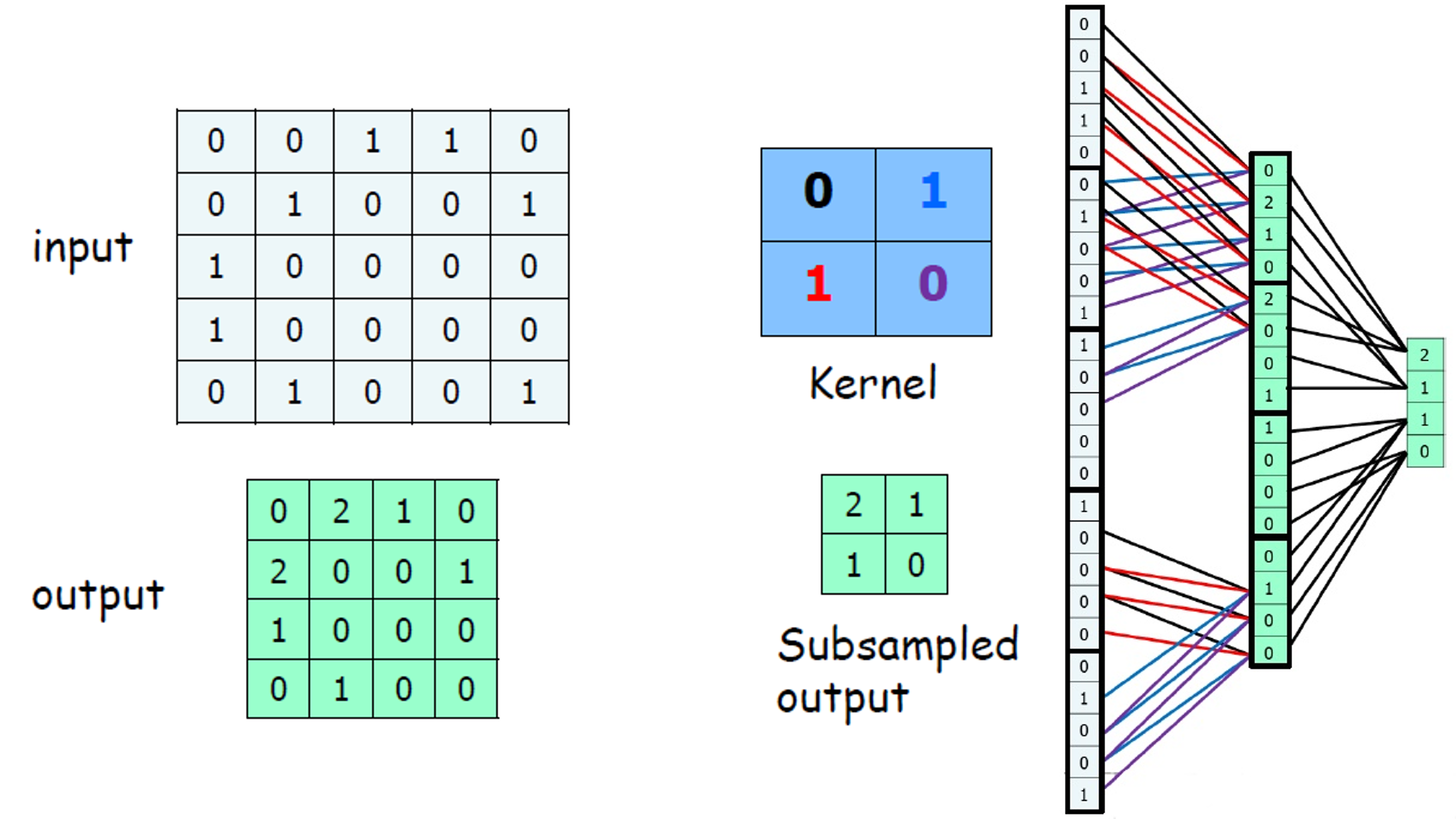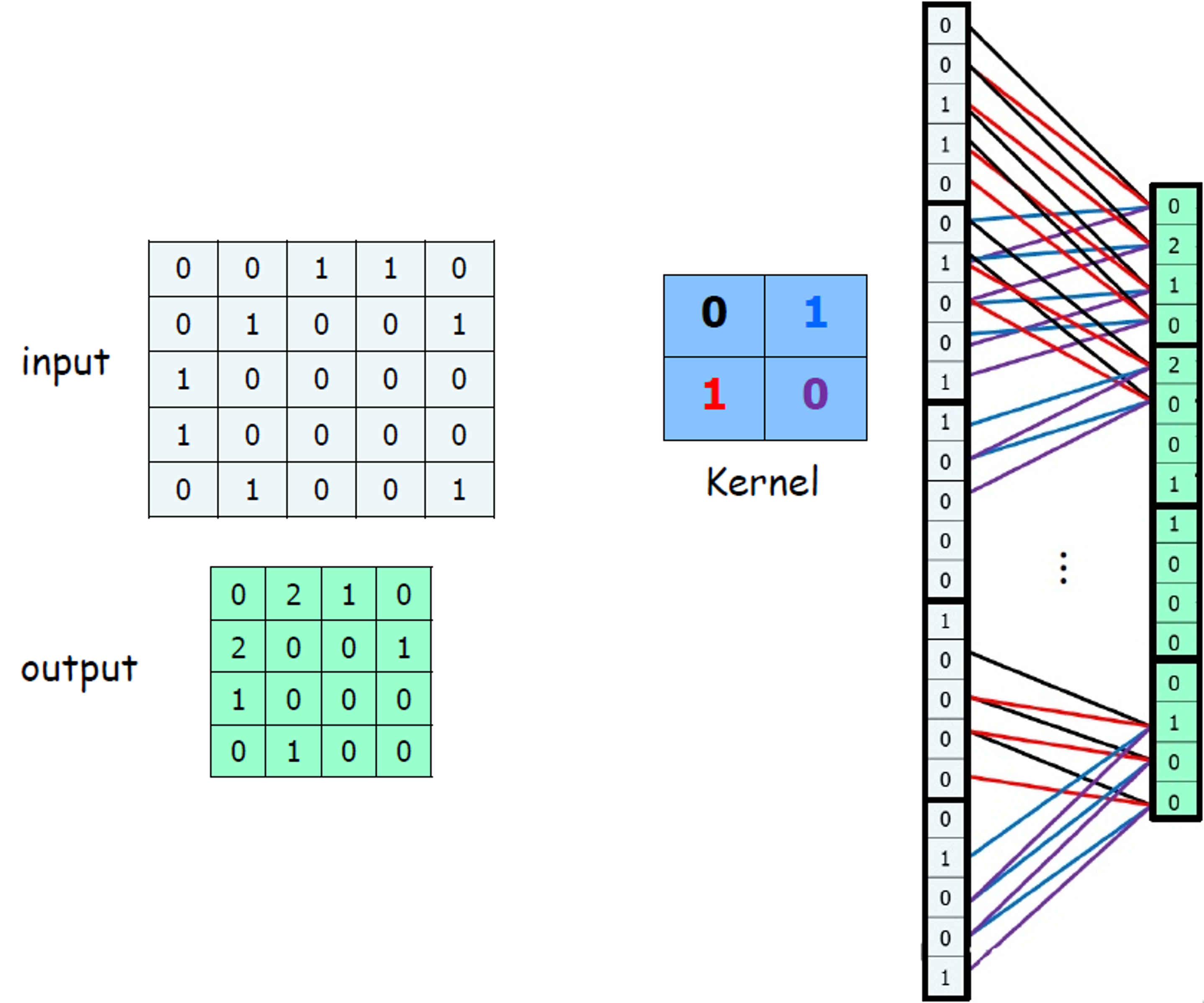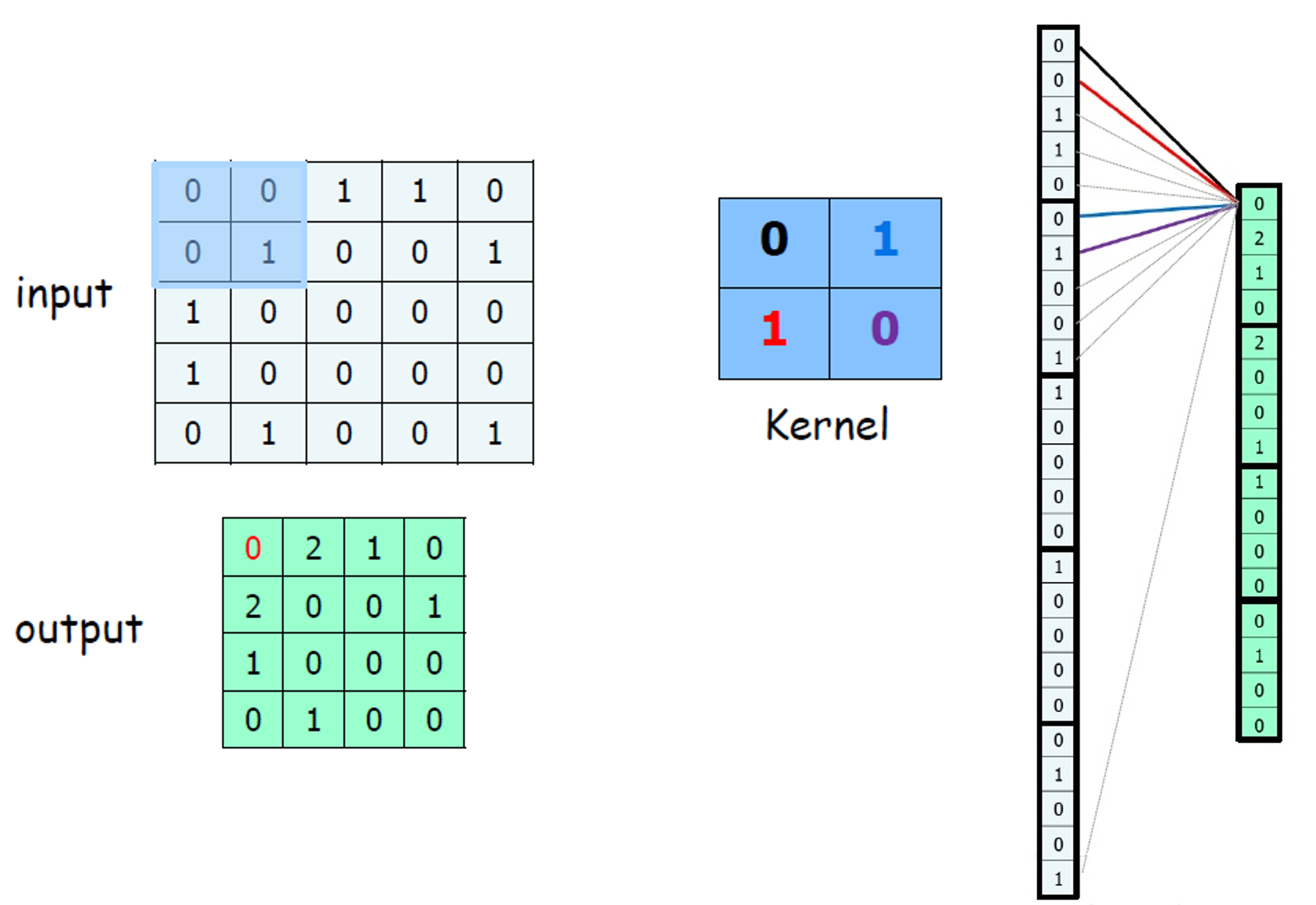 추가적으로 입력 이미지나 영상에서 특정 위치에서 발생한 특징이 다른 위치에서도 같은 방식으로 감지될 수 있도록 하는 효과를 가지고 있다. 아래의 그림에서 우리는 그림을 한칸 내렸지만 0이 아닌 값이 더 많이 일치한다.
