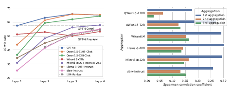 먼저, 제안자들이 생성한 답변 중 하나를 선택하는 집계자 모델을 사용하는 LLM 기반 랭커와 MoA를 비교합니다. 결과는 그림 4에 나와 있으며, MoA 접근 방식이 LLM 랭커 기반을 크게 능가하는 것을 볼 수 있습니다. MoA가 랭킹 접근 방식을 능가한다는 사실은 집계자가 제안자들이 생성한 답변 중 하나를 단순히 선택하는 것이 아니라, 모든 제안된 생성물을 정교하게 집계할 수 있음을 시사합니다.