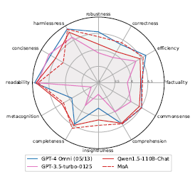 FLASK는 모델을 세밀하게 평가합니다. 이러한 메트릭 중에서 MoA는 여러 주요 측면에서 뛰어난 성과를 보였습니다. 특히, 우리의 방법론은 견고성, 정확성, 효율성, 사실성, 상식성, 통찰력, 완전성에서 상당한 개선을 보여줍니다. 이는 집계자인 Qwen-110B-Chat의 단일 모델 점수와 비교하여 두드러집니다. 또한, MoA는 정확성, 사실성, 통찰력, 완전성, 메타인지 측면에서 GPT-4 Omni를 능가합니다. 한 가지 덜 우수한 메트릭은 간결성으로, 모델이 다소 더 장황한 출력을 생성했습니다.