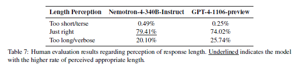 인간 평가에서의 보조 기준으로, 평가자들의 길이 인식을 표 7에서 확인할 수 있습니다. 결과는 평가자들이 Nemotron-4-340B-Instruct의 응답 길이를 적절하다고 여기는 비율이 약간 더 높다는 것을 보여줍니다 (79.41% vs 74.02%). 주목할 만한 점은 이러한 이득이 주로 긴/장황한 응답 비율의 감소에서 비롯된다는 것입니다 (20.10% vs 25.74%).