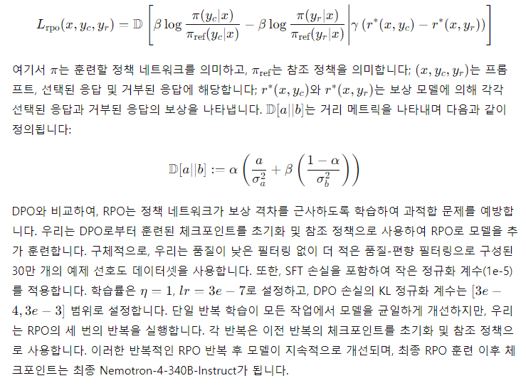 보상 인식 선호도 최적화(RPO): 3.2.3절에서 설명한 바와 같이, 우리의 선호도 데이터의 대부분은 합성 데이터이며, 그 선호도 순위는 Nemotron-4-340B-Reward 모델의 보상에 따라 판단됩니다. DPO는 두 응답 간의 이진 순위만 사용하지만, 응답 간의 차이에는 더 많은 정보가 포함되어 있습니다. 경험적으로, 일부 거부된 응답이 선택된 응답보다 약간 나은 경우도 있으며, 일부 거부된 응답은 훨씬 뒤처지는 경우도 있습니다. 이러한 차이를 무시하면, DPO는 선택된 응답과 거부된 응답 간의 내재적 보상 격차를 최대화하지만, 이는 고품질의 거부된 응답을 "잊어버리는" 현상을 초래합니다. 이를 극복하기 위해, 우리는 보상 인식 선호도 최적화(RPO)라는 새로운 알고리즘을 제안합니다. 이는 정책 네트워크가 정책 참조와의 보상 격차를 근사하도록 시도하며, 구체적으로는 정책 네트워크가 정의한 보상 격차를 근사하려고 합니다. 이는 다음과 같은 새로운 손실 함수를 도입하게 됩니다: