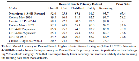 Ouyang et al. (2022)와 Touvron et al. (2023)에서 사용된 쌍별 랭킹 모델과 달리, 우리는 다속성 회귀 보상 모델이 길지만 도움이 되지 않는 응답을 길이만으로 선호하는 등의 무관한 특성을 실질적인 도움으로부터 분리하는 데 더 효과적이라는 것을 발견했습니다. 또한 회귀 모델은 세밀한 보상을 예측하는 데 더 우수하며, 유사한 응답 간의 도움 정도의 미묘한 차이를 포착합니다. 회귀 보상 모델은 Nemotron-4-340B-Base 모델의 최종 소프트맥스 층을 새로운 보상 “헤드”로 대체하여 구축됩니다. 이 “헤드”는 마지막 층의 은닉 상태를 HelpSteer 속성(도움 정도, 정확성, 일관성, 복잡성, 장황함)의 5차원 벡터로 매핑하는 선형 투영입니다. 추론 시 이러한 속성 값들은 가중 합계를 통해 전체 보상으로 집계될 수 있습니다. 자세한 내용은 Wang et al. (2024)에 포함되어 있습니다. 우리는 이러한 모델이 RewardBench(Lambert et al., 2024)에서 매우 잘 작동하며, 발표 시점에서 최고 정확도를 달성한 것을 확인했습니다. 다양한 카테고리의 점수는 표 4에 나와 있습니다.