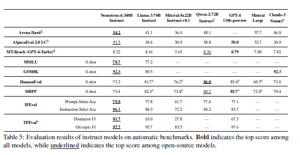 표 5에서 볼 수 있듯이, Nemotron-4-340B-Instruct는 현재 사용 가능한 공개 액세스 모델과 경쟁력을 갖추고 있습니다. 지시 모델의 경우, 우리는 제로샷 평가가 가장 중요한 설정이라고 믿습니다. 이는 사전 예시 없이 지시를 정확히 따르는 모델의 능력을 평가하기 때문입니다. 이 설정은 사람들이 실제 세계에서 LLM과 상호작용하는 방식과 더 유사합니다. 투명성과 재현성을 위해, 우리는 평가에 사용된 프롬프트를 부록 E 1에 포함했습니다.
