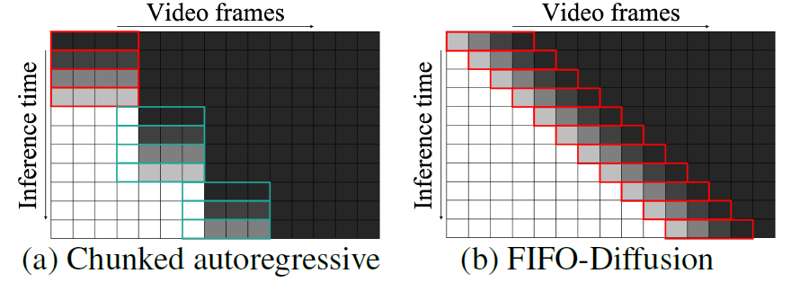 Figure 3: 긴 비디오 생성을 위해 제안된 청크드 자동회귀(chunked autoregressive) 방법과 FIFO-Diffusion의 비교입니다. 무작위 노이즈(검정색)는 모델에 의해 반복적으로 디노이징되어 이미지 잠재 공간(흰색)으로 변환됩니다. 빨간 상자는 사전 학습된 기본 모델의 디노이징 네트워크를 나타내고, 녹색 상자는 추가 훈련으로 얻어진 예측 네트워크를 나타냅니다.