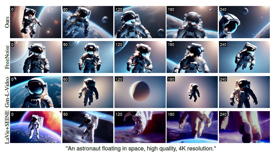 Figure 7: FIFO-Diffusion을 적용한 VideoCrafter2(첫 번째), VideoCrafter2에 적용한 FreeNoise(두 번째), VideoCrafter2에 적용한 Gen-L-Video(세 번째), 그리고 LaVie + SEINE(마지막)에 의해 생성된 샘플 비디오. 각 프레임의 왼쪽 상단에 있는 숫자는 프레임 인덱스를 나타냅니다.