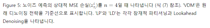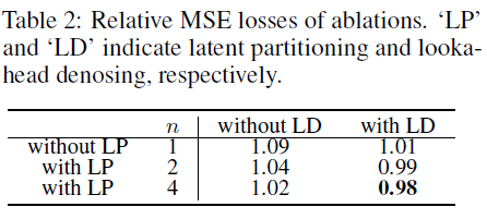 표 2: 소거 연구의 상대적 MSE 손실. 'LP'와 'LD'는 각각 잠재적 파티셔닝과 Lookahead Denoising을 나타냅니다.