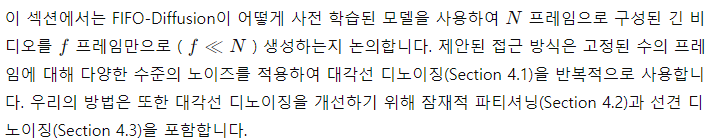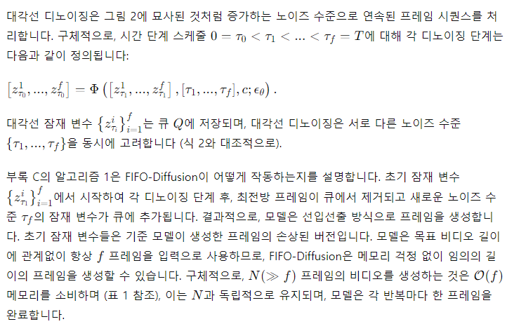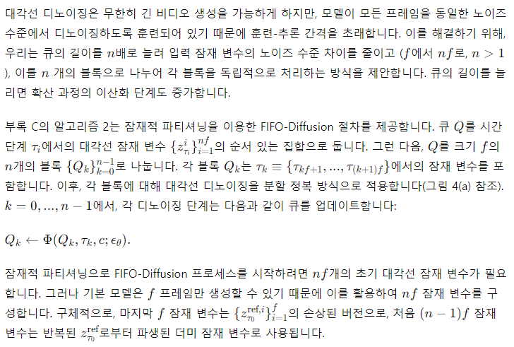 제안된 추론 기술인 FIFO-Diffusion은 추가 훈련 없이 긴 비디오 생성을 실현합니다. 이는 짧은 클립으로 사전 학습된 비디오 생성 확산 모델을 기반으로 임의의 길이의 비디오를 생성할 수 있게 합니다. 또한, FIFO-Diffusion은 청크드 자동회귀 방법의 한계를 효과적으로 극복하며, 모든 프레임이 충분한 수의 선행 프레임을 참조할 수 있게 합니다. 우리 접근 방식은 큐를 사용하여 시간 경과에 따라 단조롭게 증가하는 다양한 노이즈 수준을 가진 프레임 시퀀스를 유지하면서, 첫 번째 프레임이 완전히 디노이징될 때마다 큐의 앞부분에서 제거되고 새로운 무작위 노이즈 이미지가 꼬리에 추가되는 방식으로 프레임을 대각선 디노이징(Section 4.1)을 통해 생성합니다. 대각선 디노이징은 이점과 단점을 모두 제공합니다. 더 노이즈가 많은 프레임은 이전 디퓨전 단계에서 더 깨끗한 프레임을 참조함으로써 이점을 얻지만, 모델은 동시에 처리되는 프레임들의 노이즈 수준 차이로 인해 훈련-추론 간격에서 어려움을 겪을 수 있습니다. 이러한 한계를 극복하고 대각선 디노이징의 이점을 수용하기 위해, 우리는 잠재적 파티셔닝(Section 4.2)과 선견 디노이징(Section 4.3)을 제안합니다. 잠재적 파티셔닝은 노이즈 입력 이미지의 노이즈 수준 범위를 제한하고, 디퓨전 과정을 더 세밀하게 이산화하여 비디오 품질을 향상시킵니다. 추가적으로, 선견 디노이징은 기본 모델의 능력을 향상시켜 더욱 정확한 노이즈 예측을 제공합니다. 또한, 잠재적 파티셔닝과 선견 디노이징은 모두 여러 GPU에서 병렬 처리가 가능합니다.