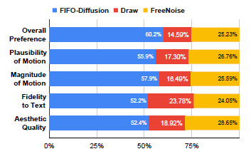 Figure 8: FIFO-Diffusion과 FreeNoise 간의 사용자 연구 결과를 다섯 가지 기준으로 비교한 그래프.