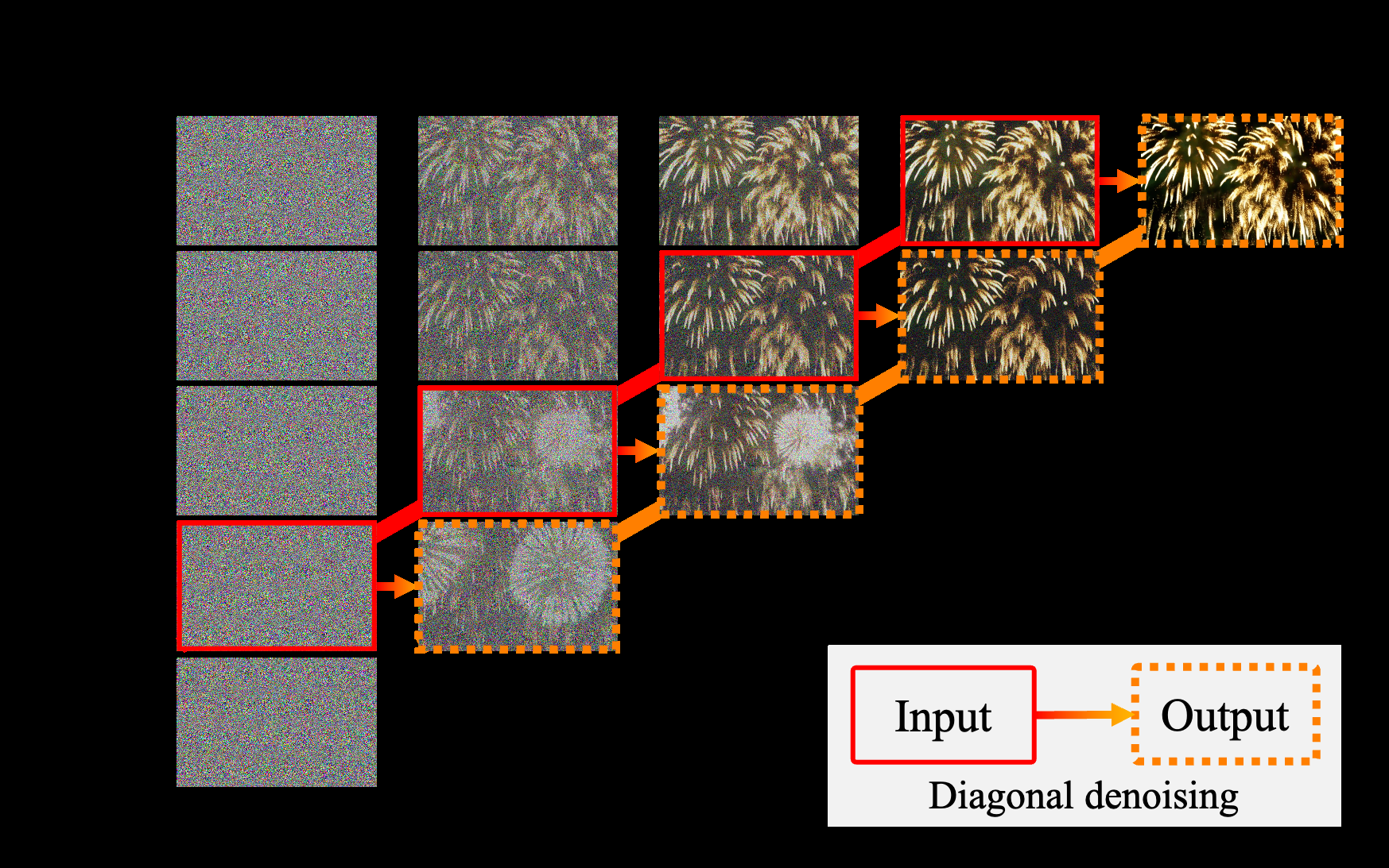 Figure 2: 대각선 디노이징(diagonal denoising)을 f = 4로 설명한 그림입니다. 실선으로 둘러싸인 프레임들은 모델 입력을 나타내며, 점선으로 둘러싸인 프레임들은 디노이징된 버전을 나타냅니다. 디노이징 후, 오른쪽 상단 모서리에 완전히 디노이징된 인스턴스가 큐에서 제거되고 새로운 무작위 노이즈가 큐에 추가됩니다.