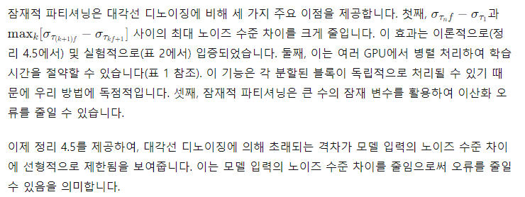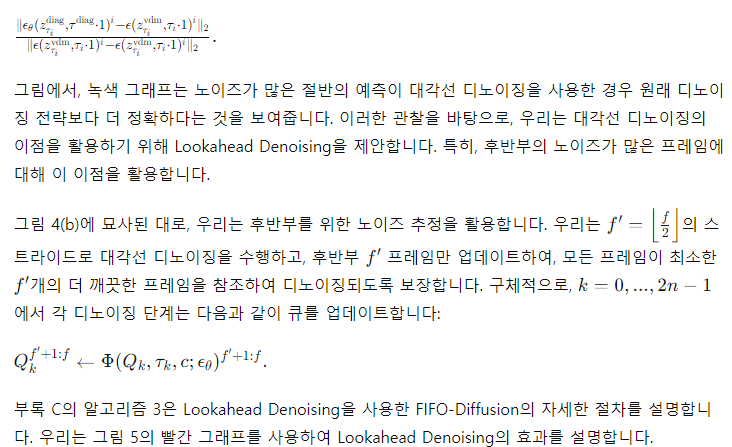 몇몇 초기 시간 단계를 제외하고, Lookahead Denoising을 통한 노이즈 예측은 기본 모델의 디노이징 능력을 향상시켜, 4.2절에서 설명한 훈련-추론 간격을 거의 완전히 극복합니다. 모델 출력의 절반만을 사용하기 때문에 이 접근 방식은 대각선 디노이징의 두 배의 계산이 필요합니다. 그러나 계산 오버헤드에 대한 우려는 잠재적 파티셔닝과 동일한 방식으로 병렬화를 통해 쉽게 해결할 수 있습니다 (표 1 참조).