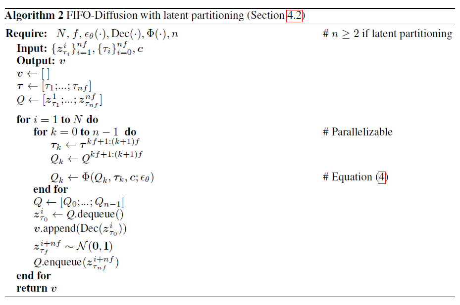 - FIFO-Diffusion은 기준 모델을 제공하는 경우 생성 비디오 길이에 관계없이 일정한 양의 메모리를 사용하며, 여러 GPU에서 병렬 추론을 쉽게 수행할 수 있습니다.
