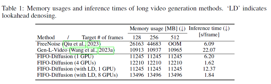 표 1: 긴 비디오 생성 방법의 메모리 사용량과 추론 시간. 'LD'는 Lookahead Denoising을 나타냅니다.