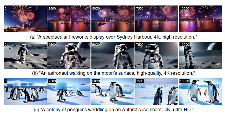 Figure 1: FIFO-Diffusion이 사전 학습된 텍스트 조건 비디오 생성 모델인 VideoCrafter2(Chen et al., 2024)를 기반으로 생성한 10,000프레임 길이의 비디오 일러스트레이션. 각 이미지의 왼쪽 상단에 있는 숫자는 프레임 인덱스를 나타냅니다. 결과는 FIFO-Diffusion이 짧은 클립(16프레임)으로 훈련된 모델을 기반으로 장기간 비디오를 효과적으로 생성할 수 있으며, 품질 저하 없이 장면의 동적 요소와 의미를 유지함을 명확히 보여줍니다.