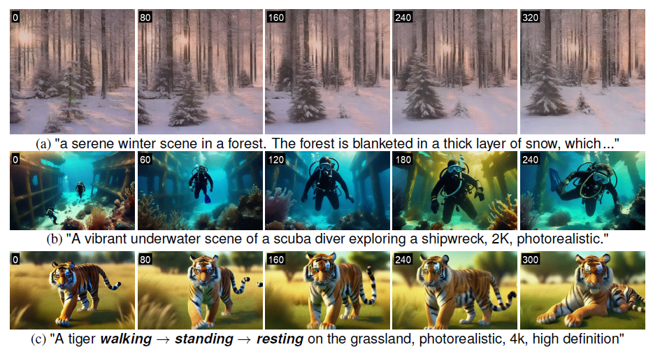 또한, 그림 6 (c)는 FIFO-Diffusion이 프롬프트를 연속적으로 변경하여 많은 움직임을 포함한 비디오를 생성할 수 있음을 보여줍니다. 여러 움직임을 생성하고 장면 간 원활한 전환을 할 수 있는 능력은 우리의 방법의 실용성을 강조합니다. 다중 프롬프트 생성을 더 자세히 설명한 내용은 부록 E.1에 있습니다. 추가 예제와 다른 기준 모델을 기반으로 한 비디오 데모는 부록 D와 E 및 우리의 프로젝트 페이지1에서 확인할 수 있습니다.