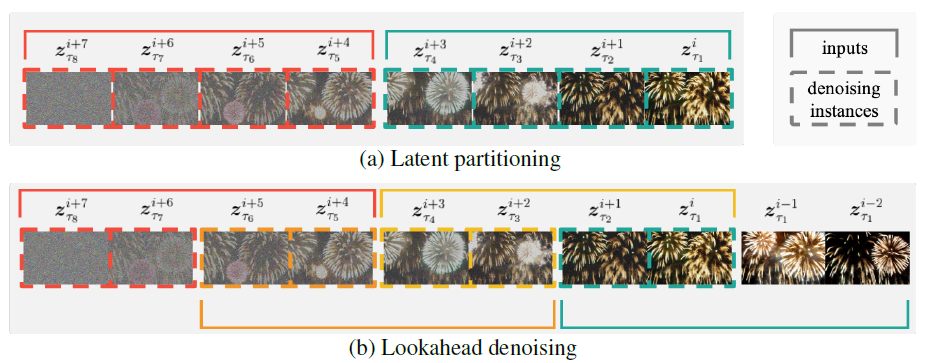 Figure 4: 잠재적 파티셔닝과 선견 디노이징을 설명한 그림으로, 여기서 f= 및 n=입니다. (a) 잠재적 파티셔닝은 확산 과정을 n부분으로 나누어 최대 노이즈 수준 차이를 줄입니다. (b) (a)에서 선견 디노이징을 통해 모든 프레임이 적절한 수의 이전 프레임과 함께 디노이징될 수 있으며, (a)보다 두 배 더 많은 계산이 필요합니다.