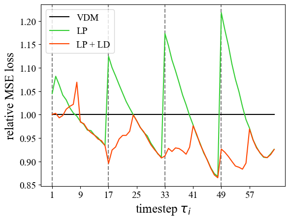 대각선 디노이징은 훈련-추론 간격을 초래하지만, 더 깨끗한 프레임을 관찰함으로써 노이즈가 많은 프레임이 이점을 얻어 더 정확한 디노이징을 가능하게 한다는 점에서 또 다른 이점을 제공합니다. 경험적 증거로, 그림 5는 대각선 디노이징이 원래 디노이징 전략에 비해 노이즈 예측에서의 상대적 MSE 손실을 보여줍니다. 상대적 MSE의 공식 정의는 다음과 같습니다: