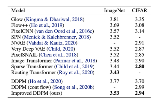 그림 6. 개선된 DDPM의 음의 로그-확률을 다른 확률 기반 생성 모델과 비교. NLL은 비트/딤 단위로 보고됩니다. (이미지 출처: Nichol & Dhariwal, 2021)