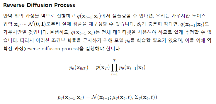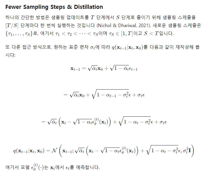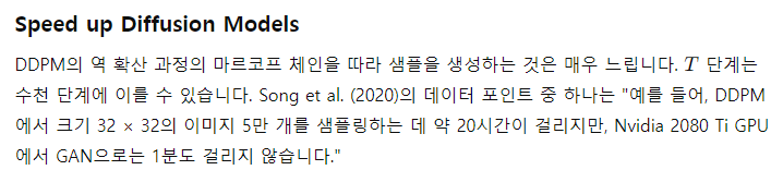 단점: 확산 모델은 샘플을 생성하기 위해 긴 확산 단계의 마르코프 체인에 의존하기 때문에 시간과 계산 비용이 상당히 많이 들 수 있습니다. 프로세스를 훨씬 빠르게 만드는 새로운 방법이 제안되었지만, 샘플링 속도는 여전히 GAN보다 느립니다.