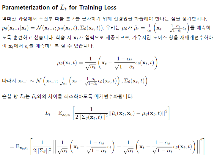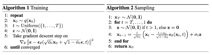 그림 4. DDPM의 트레이닝 및 샘플링 알고리즘(이미지 출처: Ho et al. 2020)