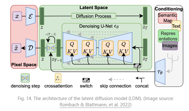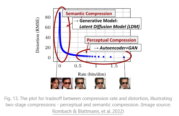 잠재 확산 모델(LDM; Rombach & Blattmann 등, 2022)은 픽셀 공간 대신 잠재 공간에서 확산 과정을 실행하여 훈련 비용은 낮추고 추론 속도는 더 빠르게 만듭니다. 이는 이미지의 대부분의 비트가 지각적 디테일에 기여하고 공격적인 압축 후에도 의미 및 개념적 구성이 여전히 남아 있다는 관찰에서 착안한 것입니다. LDM은 먼저 자동 인코더로 픽셀 수준의 중복성을 제거한 다음, 학습된 잠복에 대한 확산 과정을 통해 의미적 개념을 조작/생성함으로써 지각적 압축과 의미적 압축을 생성 모델링 학습으로 느슨하게 분해합니다.