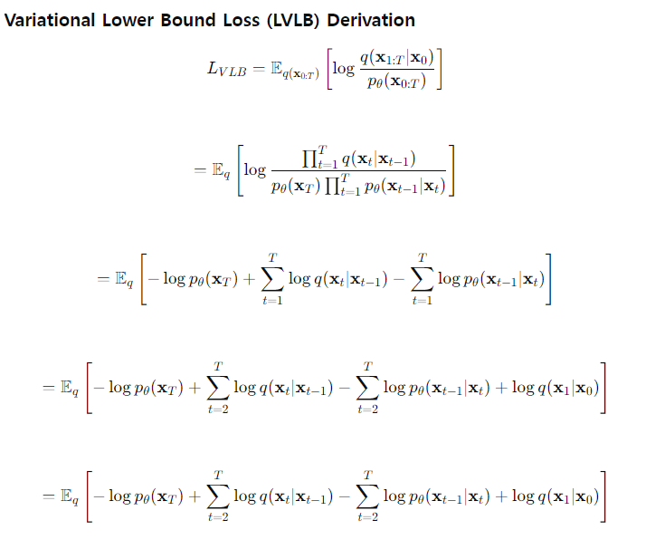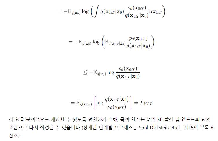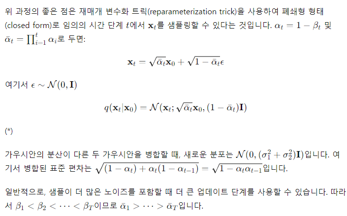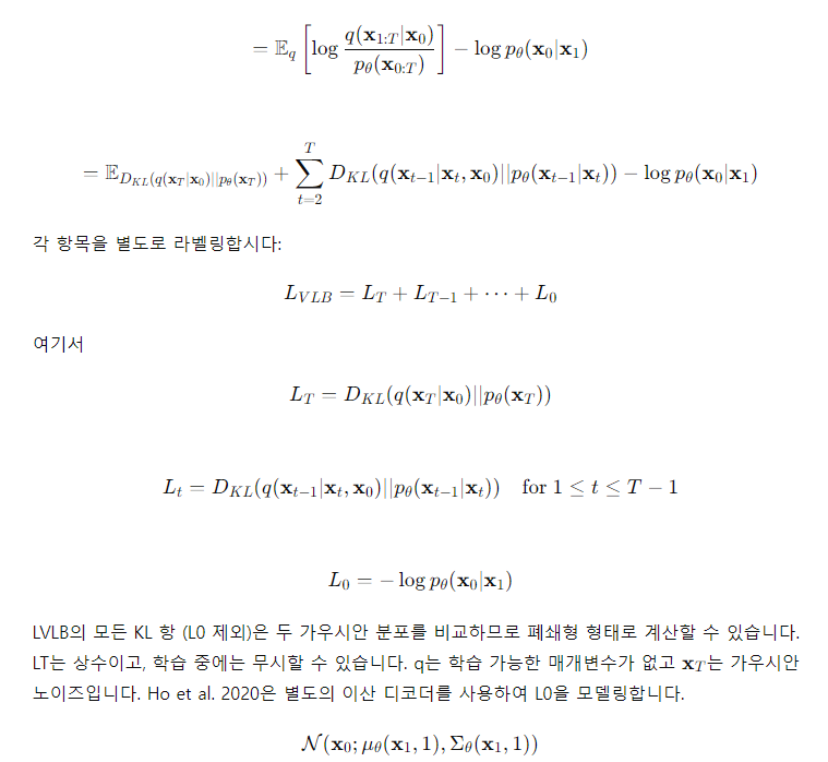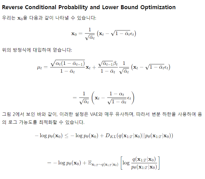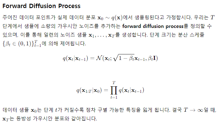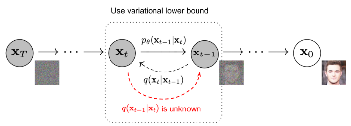 그림 2. 노이즈를 천천히 추가(제거)하여 샘플을 생성하는 순방향(역방향) 확산 과정의 마르코프 체인. (이미지 출처: Ho 외. 2020, 몇 가지 주석 추가)