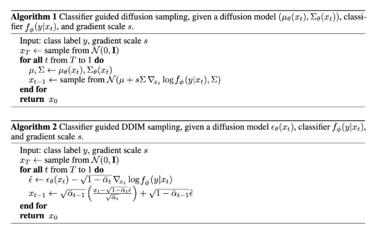 그림 7. 이 알고리즘은 분류기의 지침을 사용하여 DDPM 및 DDIM으로 조건부 생성을 실행합니다. (이미지 출처: Dhariwal & Nichol, 2021])
