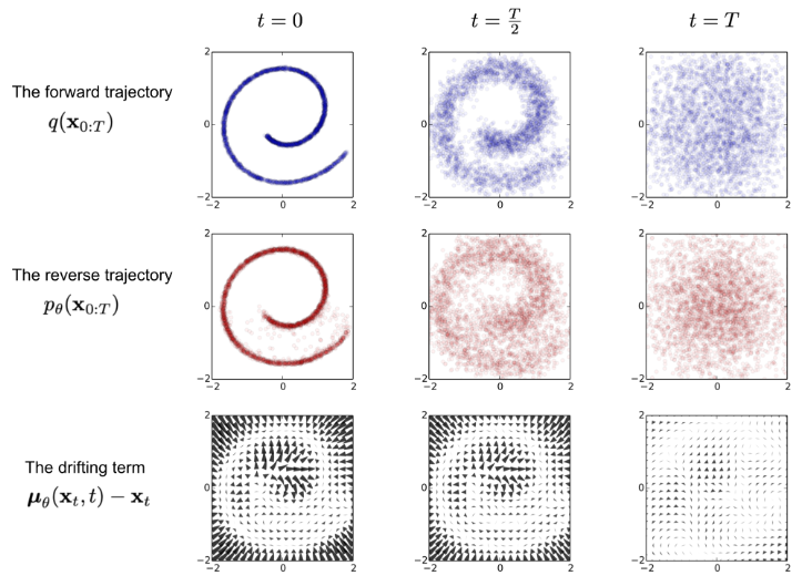 그림 3. 2D 스위스 롤 데이터를 모델링하기 위한 확산 모델 훈련의 예. (이미지 출처: Sohl-Dickstein 외., 2015)