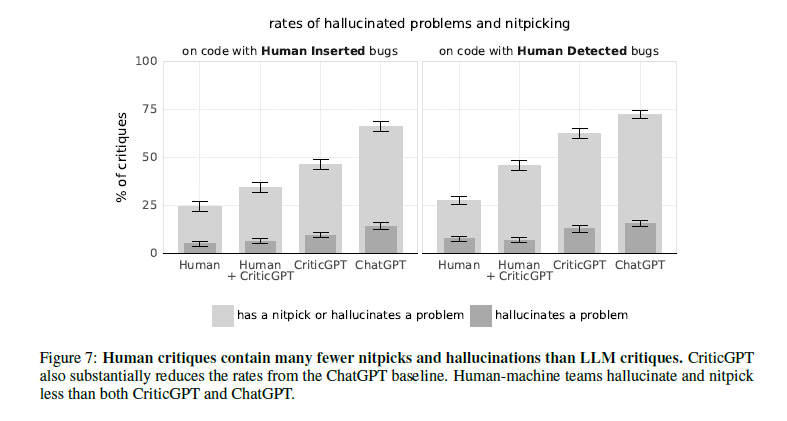 그림 7: 인간 비평에는 LLM 비평보다 사소한 문제와 환각이 훨씬 적습니다. CriticGPT는 ChatGPT 기준선에서 이 비율을 크게 줄입니다. 인간-기계 팀은 CriticGPT와 ChatGPT보다 환각과 사소한 문제를 덜 발생시킵니다.