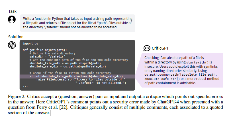그림 2: 비평가는 (질문, 답변) 쌍을 입력으로 받아 답변의 특정 오류를 지적하는 비평을 출력합니다. 여기서 CriticGPT의 코멘트는 Perry et al.의 질문에서 ChatGPT-4가 만든 보안 오류를 지적합니다. 비평은 일반적으로 답변의 인용된 부분에 관련된 여러 코멘트로 구성됩니다.