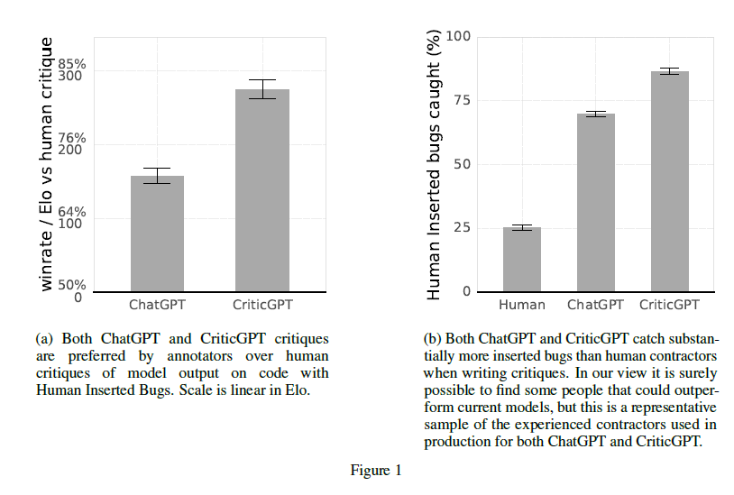 (b) ChatGPT와 CriticGPT는 비평을 작성할 때 인간 계약자보다 훨씬 더 많은 삽입된 버그를 발견합니다. 우리의 관점에서 현재 모델을 능가할 수 있는 사람들을 찾는 것은 가능하지만, 이는 ChatGPT와 CriticGPT의 생산에 사용된 숙련된 계약자의 대표적인 샘플입니다.