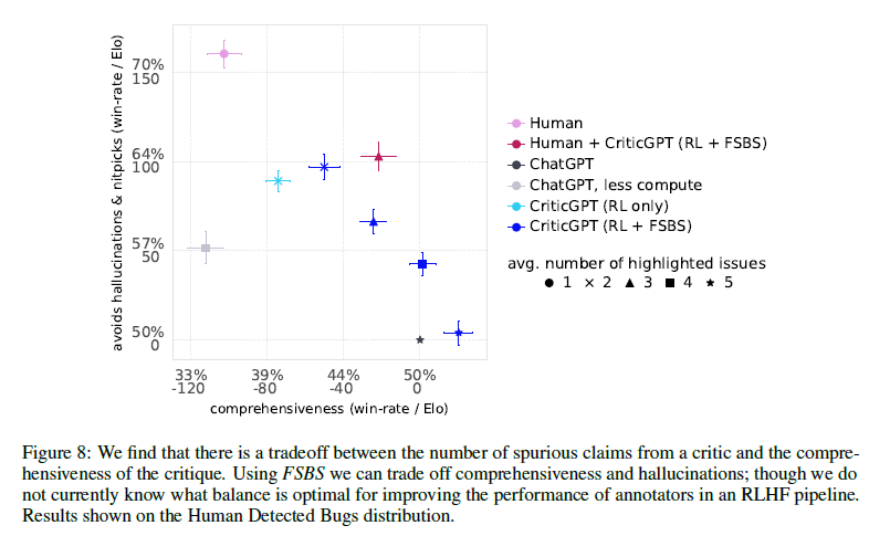 FSBS(2.3에 자세히 설명됨)는 이를 완화하기 위해 우리의 보상 모델과 테스트 시간 검색을 사용합니다. 스칼라 길이 페널티를 변경함으로써, 우리는 포괄성과 잘못된 주장 간의 파레토 곡선을 설정할 수 있으며, 이는 그림 8에 나와 있습니다. FSBS는 배포 시 비평 모델을 재훈련하지 않고도 RLHF 데이터 수집을 위한 좋은 균형을 선택할 수 있게 해줍니다. 부록 7.1에서는 ChatGPT와 우리의 보상 모델을 결합하는 것이 덜 효과적임을 보여줍니다. 이러한 균형을 고려하면 인간-기계 팀의 이점도 드러납니다. 함께 작업할 때(Human+CriticGPT 팀, 2.1.3에서 설명한 대로) 인간-기계 팀은 모델 전용 파레토 전선을 넘어섭니다. 이 인간이 감지한 버그 평가에서 RL-only CriticGPT는 ChatGPT 기준선보다 덜 포괄적일 수 있습니다. 이는 두 가지 효과에 의해 발생한다고 생각합니다. 첫째, RL-only CriticGPT는 더 보수적이며, 재현율의 대가로 훨씬 더 높은 정밀도를 가진 비평을 생성합니다. 둘째, ChatGPT와 CriticGPT 사이의 컴퓨팅 감소가 있었습니다. FSBS는 더 포괄적인 비평을 결과로 냅니다.