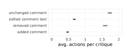 그림 4: 계약자는 미리 채워진 비평과 어떻게 상호 작용하나요? 휴먼 머신 비평 팀에서 계약자가 한 일을 측정했습니다. LLM 코멘트를 수정하지 않고 그대로 유지하거나 삭제하는 경우가 가장 흔했습니다. 새 코멘트를 추가하고 문구를 수정하는 것은 덜 일반적이었습니다.
