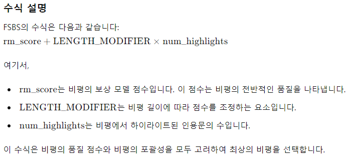비평가 모델은 (질문, 답변) 쌍을 입력으로 받아 답변의 인용문과 잠재적인 문제에 대한 주석을 포함하는 구조화된 비평을 출력합니다. 비평에서 답변의 인용된 부분은 "하이라이트"로 표시되며, 이는 "```"로 시작하는 마크다운 코드 블록을 통해 인용되고, 그 하이라이트에서 발생하는 오류를 나타내는 주석이 뒤따릅니다. FSBS에서는 모델이 제한된 샘플링으로 하이라이트된 부분을 생성하도록 강제하고, 다음 표현식에 따라 최고 점수를 받은 비평을 선택합니다: