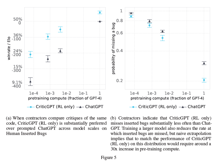 (b) 계약자들은 CriticGPT(RL 전용)가 삽입된 버그를 프롬프트된 ChatGPT보다 훨씬 덜 놓친다고 표시합니다. 더 큰 모델을 훈련하는 것도 삽입된 버그를 놓치는 비율을 줄이지만, 이 분포에서 CriticGPT(RL 전용)의 성능을 맞추기 위해서는 사전 훈련 컴퓨팅을 약 30배 늘려야 합니다.
