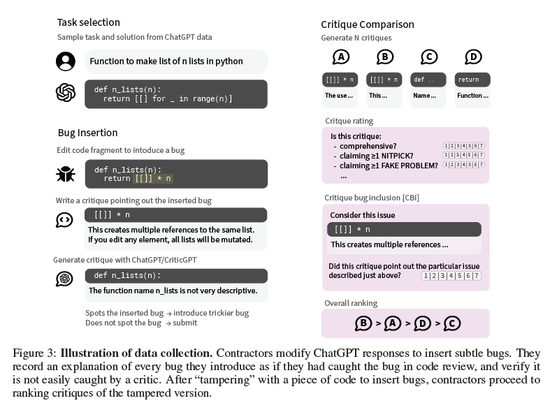그림 3: 데이터 수집의 예시. 계약자들은 ChatGPT 응답을 수정하여 미세한 버그를 삽입합니다. 그들은 코드 리뷰에서 버그를 잡은 것처럼 삽입한 모든 버그에 대한 설명을 기록하고, 비평가가 쉽게 잡을 수 없음을 확인합니다. 코드에 버그를 삽입한 후, 계약자들은 수정된 버전의 비평을 평가합니다.