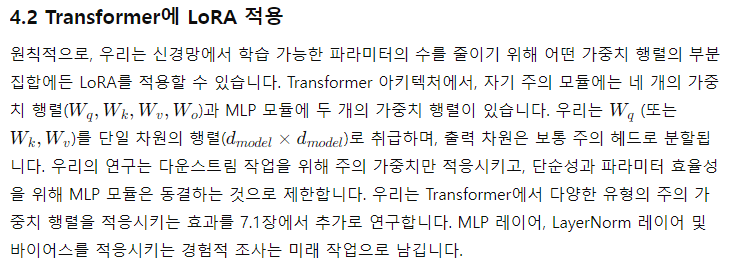 - 다른 효율적인 적응 방법과의 결합: LoRA는 다른 효율적인 적응 방법과 결합되어 상호 보완적인 개선을 제공할 수 있습니다.