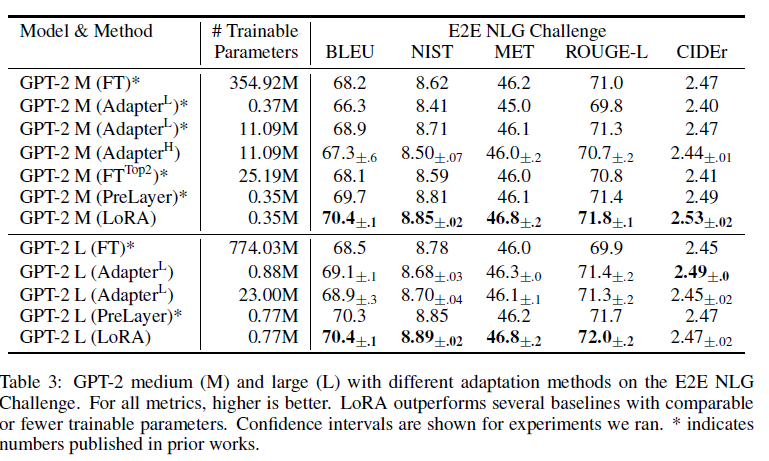 모든 메트릭에서 높을수록 좋습니다. LoRA는 비교 가능한 또는 더 적은 학습 가능한 파라미터를 가진 여러 기준선을 능가합니다. 우리가 실행한 실험에 대한 신뢰 구간이 표시되어 있습니다. *는 이전 연구에서 발표된 숫자를 나타냅니다.
