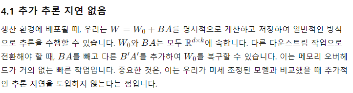 - 우리의 간단한 선형 디자인은, 배포 시에 학습 가능한 행렬을 고정된 가중치와 병합할 수 있게 하여, 구조적으로 완전 미세 조정된 모델과 비교하여 추론 지연을 도입하지 않습니다.