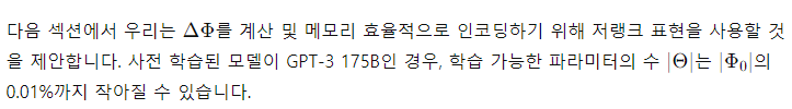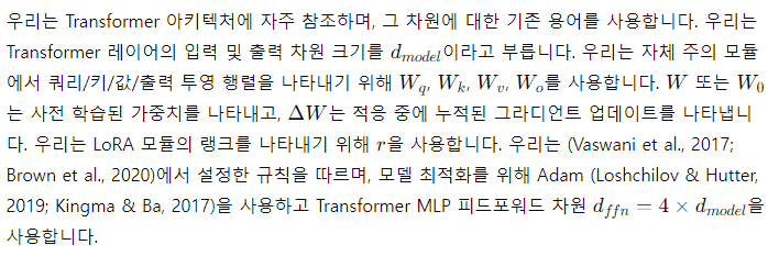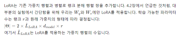 - LoRA는 많은 이전 방법들과 독립적이며, prefix-tuning과 같은 많은 방법들과 결합될 수 있습니다. 부록 E에서 예를 제공합니다.