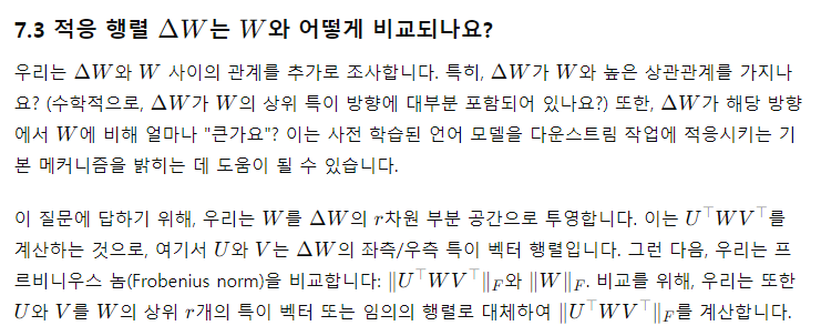 우리는 다음 질문에 답하기 위해 일련의 경험적 연구를 수행합니다: 1) 파라미터 예산 제약이 주어졌을 때, 사전 학습된 Transformer의 어느 가중치 행렬의 부분집합을 적응시켜 다운스트림 성능을 최대화해야 할까요? 2) “최적”의 적응 행렬 ΔW가 정말로 랭크 부족인가요? 그렇다면, 실제로 사용하기 좋은 랭크는 무엇인가요? 3) ΔW사이의 연결은 무엇인가요? Δ는 W와 높은 상관관계를 가지나요? ΔW는 W에 비해 얼마나 큰가요?