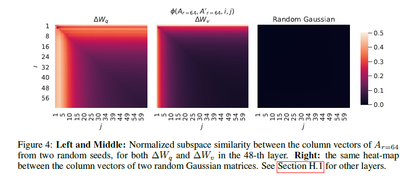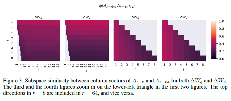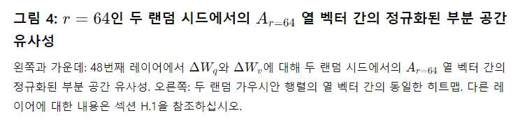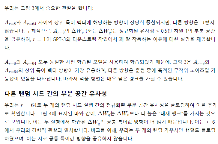 표 6은 놀랍게도 매우 작은 r에서도 LoRA가 이미 경쟁력 있는 성능을 보인다는 것을 보여줍니다(특히 { W_q,W_v} 보다 {W_ 만을 적응시킬 때 더 그렇습니다). 이는 업데이트 행렬 ΔW가 매우 작은 "내재 랭크"를 가질 수 있음을 시사합니다. 이 발견을 더 지지하기 위해, 우리는 서로 다른 값과 무작위 시드에 의해 학습된 부분 공간의 겹침을 확인합니다. 우리는 r을 증가시켜도 더 의미 있는 부분 공간을 커버하지 않으며, 이는 저랭크 적응 행렬이 충분하다는 것을 시사합니다.