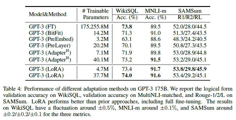 우리는 WikiSQL에서의 논리 형식 검증 정확도, MultiNLI-matched에서의 검증 정확도, SAMSum에서의 Rouge-1/2/L을 보고합니다. LoRA는 전체 미세 조정을 포함한 이전 접근 방식을 능가합니다. WikiSQL에서의 결과는 약 ±0.5%, MNLI-m에서 약 ±0.1%, 그리고 SAMSum에서의 세 가지 메트릭에 대해 각각 약 ±0.2/±0.2/±0.1의 변동성을 보입니다.