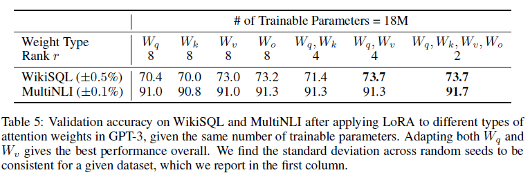 W_q와 W_v를 모두 적응시키는 것이 전반적으로 최고의 성능을 제공합니다. 주어진 데이터셋에 대해 무작위 시드에 따른 표준 편차가 일관됨을 확인하였으며, 이는 첫 번째 열에 보고됩니다.