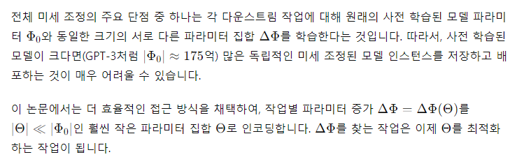 자연어 처리의 많은 응용 프로그램은 하나의 대규모 사전 학습된 언어 모델을 여러 다운스트림 응용 프로그램에 적응시키는 데 의존합니다. 이러한 적응은 보통 모든 사전 학습된 모델의 파라미터를 업데이트하는 미세 조정을 통해 이루어집니다. 미세 조정의 주요 단점은 새로운 모델이 원래 모델과 동일한 수의 파라미터를 포함한다는 점입니다. 몇 달마다 더 큰 모델이 훈련되면서, 이는 GPT-2나 RoBERTa large에서는 단순한 “불편함”에서, 1750억 개의 학습 가능한 파라미터를 가진 GPT-3에서는 중요한 배포 문제로 변화합니다.