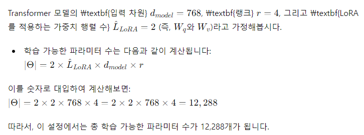 - LoRA는 훈련을 더 효율적으로 만들고, 대부분의 파라미터에 대해 그라디언트를 계산하거나 옵티마이저 상태를 유지할 필요가 없기 때문에, 적응형 옵티마이저를 사용할 때 최대 3배까지 하드웨어 진입 장벽을 낮출 수 있습니다. 대신에, 주입된 훨씬 작은 저랭크 행렬만 최적화하면 됩니다.