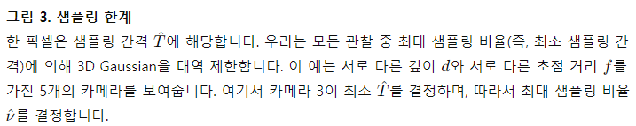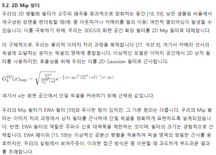 5. Mip Gaussian Splatting 이러한 문제를 극복하기 위해, 우리는 원래 3DGS 모델에 두 가지 수정을 가합니다. 특히, 우리는 학습 이미지에 의해 결정된 최대 샘플링 비율의 절반 이하로 3D 표현의 주파수를 제한하는 3D 평활화 필터를 도입하여, 줌 인할 때 고주파 왜곡을 제거합니다. 또한, 물리적 이미지 처리 과정에 내재된 상자 필터를 근사하는 2D Mip 필터로 2D 화면 공간 확장을 대체하여 앨리어싱 및 확장 문제를 효과적으로 완화합니다. 이들을 결합하면, Mip-Splatting은 다양한 샘플링 비율에서 앨리어싱 없는 렌더링을 가능하게 합니다. 이제 우리는 3D 평활화 필터와 2D Mip 필터에 대해 자세히 논의하겠습니다.