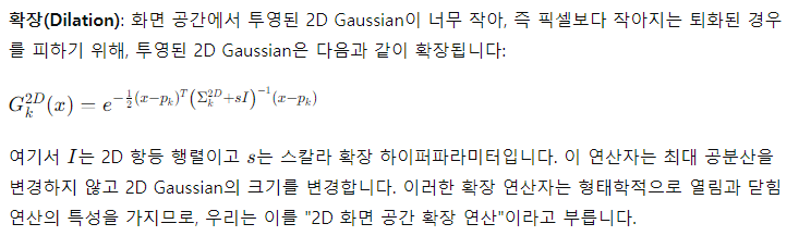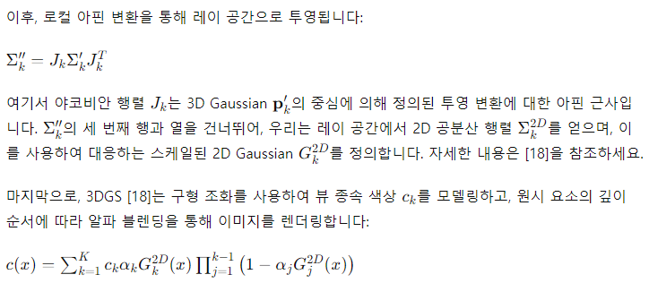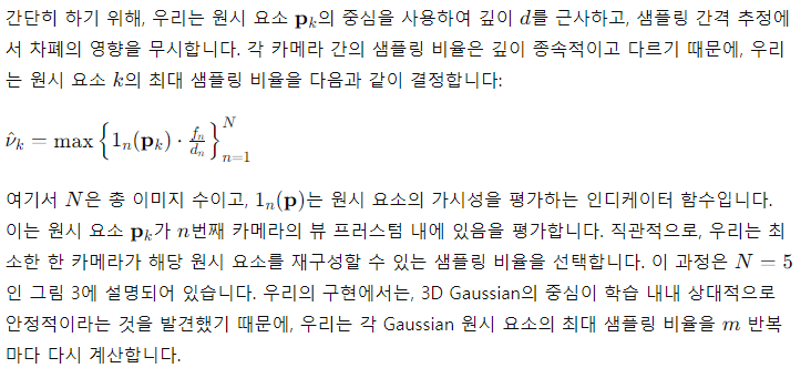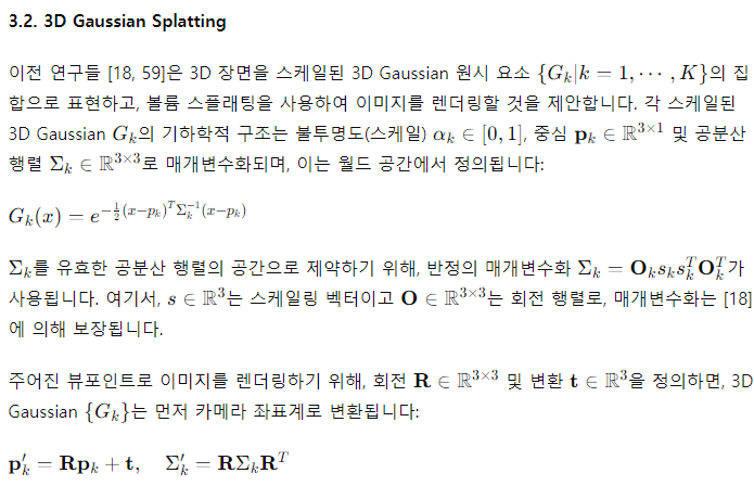 재구성 (Reconstruction): 렌더링 과정은 빠르고 미분 가능하므로, 3D Gaussian 매개변수는 다중 뷰 손실을 사용하여 효율적으로 최적화될 수 있습니다. 최적화 중에, 3D Gaussian은 장면을 더 잘 표현하기 위해 적응적으로 추가되거나 삭제됩니다. 자세한 내용은 [18]을 참조하세요.