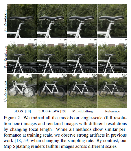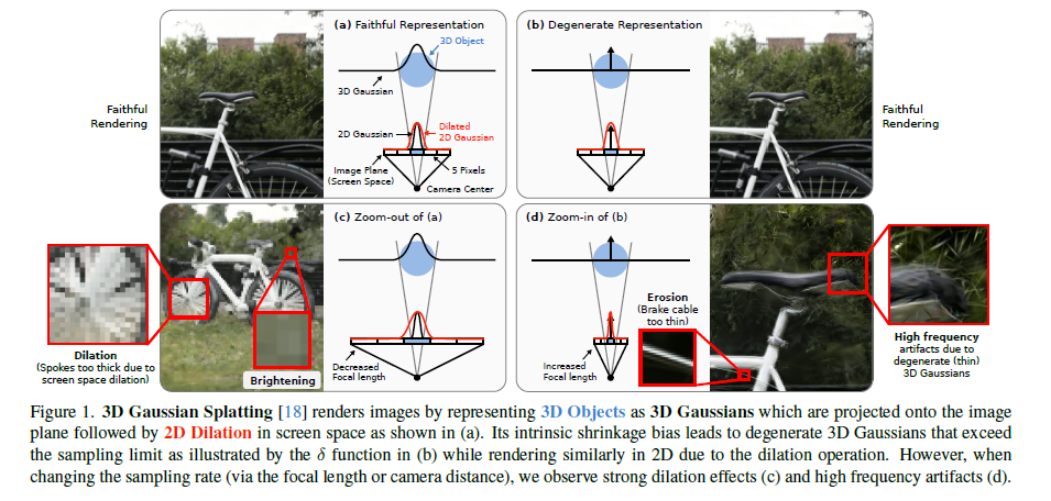 반대로, 화면 공간 확장은 샘플링 비율을 줄일 때에도 렌더링에 부정적인 영향을 미칩니다. 이는 그림 1 (c)에 설명된 것처럼 (a)의 줌 아웃 버전을 보여줍니다. 이 경우, 확장은 픽셀 간에 물리적으로 부정확한 방식으로 방사선을 퍼뜨립니다. (c)에서 3D 객체의 투영이 덮는 영역은 픽셀보다 작지만, 확장된 Gaussian은 약화되지 않아 픽셀에 물리적으로 도달하는 것보다 더 많은 빛을 축적합니다. 이는 밝기 증가와 확장 왜곡을 초래하여 자전거 바퀴의 스포크의 외관을 크게 저하합니다.