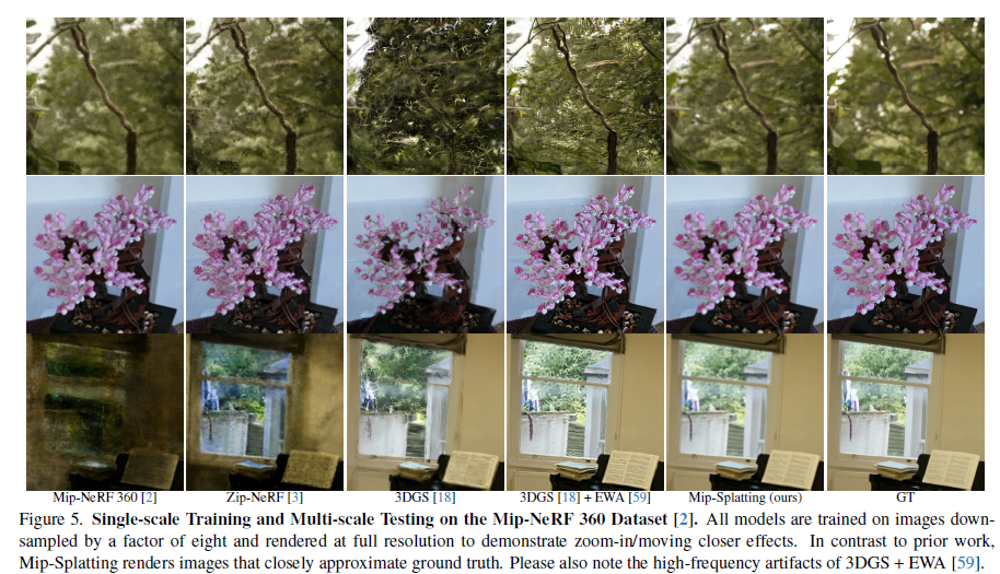 우리는 3DGS를 향상시키기 위해 3D 평활화 필터와 2D Mip 필터를 사용하여 어떤 스케일에서도 앨리어싱 없는 렌더링을 가능하게 하는 Mip-Splatting 기술을 소개했습니다. 우리의 3D 평활화 필터는 Gaussian 원시 요소의 최대 주파수를 학습 이미지에 의해 부과된 샘플링 제약에 맞추어 효과적으로 제한하며, 2D Mip 필터는 물리적 이미지 처리 과정을 모방하기 위해 상자 필터를 근사합니다. Mip-Splatting은 학습과 다른 샘플링 비율로 테스트할 때 분포 외 시나리오에서 최신 방법보다 크게 뛰어나며, 분포 외 카메라 위치와 줌 요소에 대한 일반화를 개선합니다.